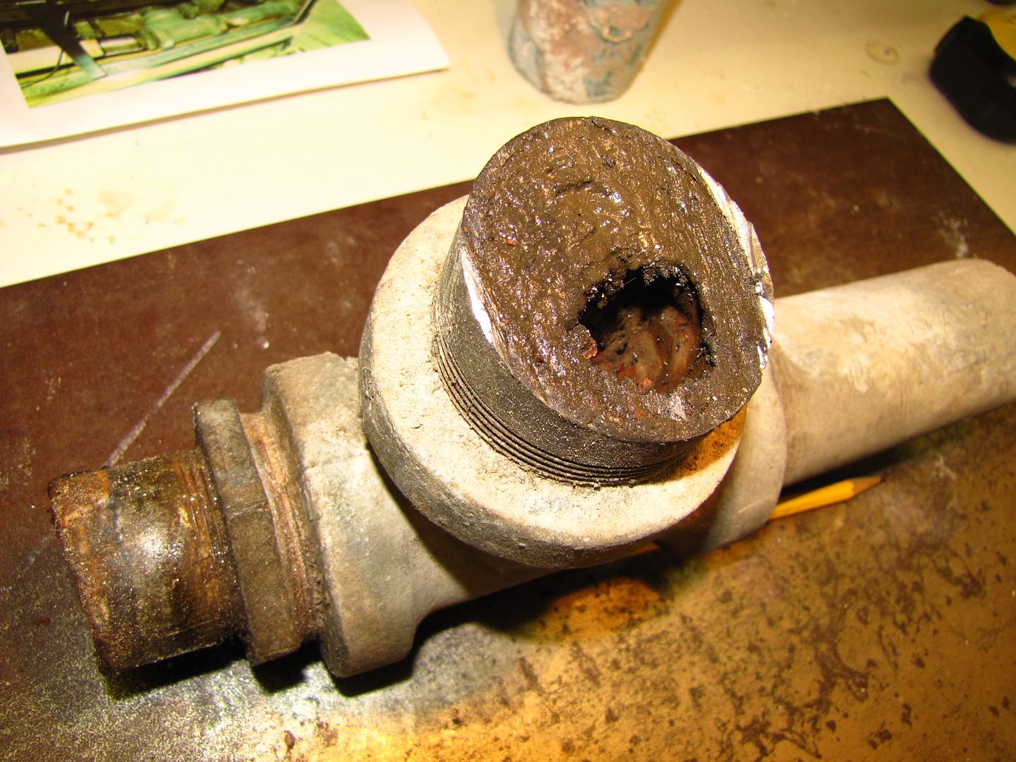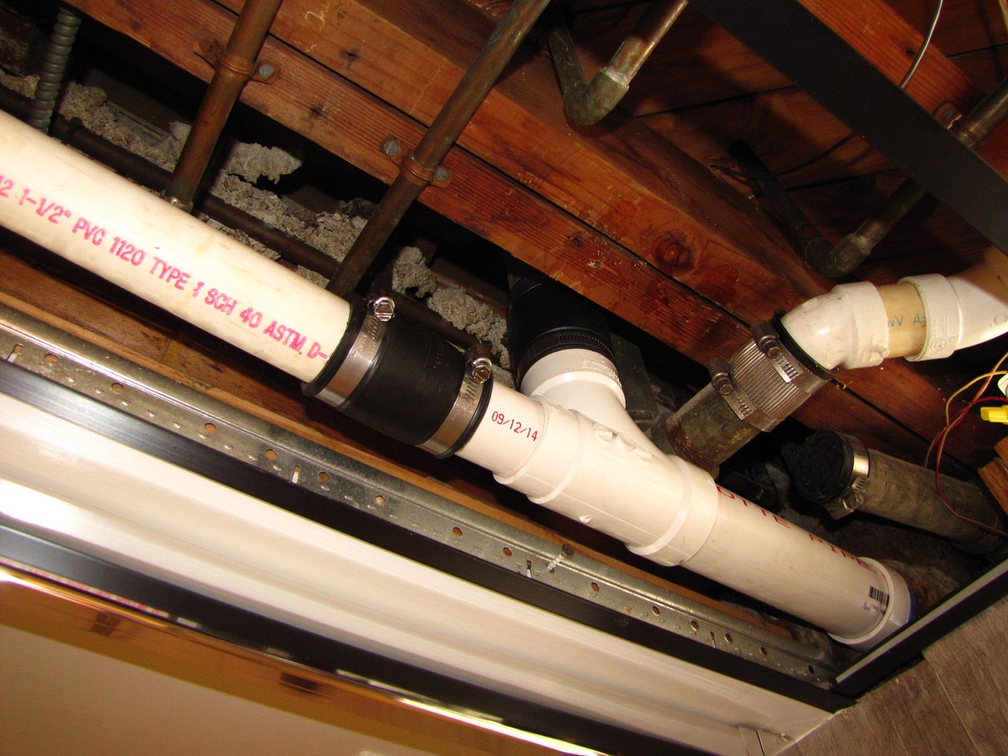 A bucket "fixed" the leak and I really wanted breakfast so I fixed the microwave. I had the switch and to make the push rod a little longer I melted the head of a pin into the end of it so it would have that extra thousandth of an inch to push the switch. So I put the thing back together and made breakfast. Now it is off to the plumbing supply to get some fittings to fix this leak that I should have take care of in 1980. This is not going to be an easy repair because it is a 2" iron sanitary Tee with two pipes coming out of it. It is to close to the beam to get a wrench on it and when I do try to turn it (after I cut it) it will crush from rust. But I was a plumber for a while and will have no trouble fixing the thing. I wish I had a tall Supermodel to hold the light.