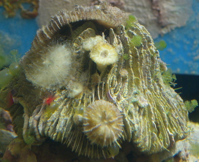 I have this green plate coral for more than 10 yrs. It arrived as a tiny hitchhiker attached to one of the live rocks, and it was smaller than a dime. After it got bigger, it came off the rock one day. It never got real big, since I never pay much attention to it. A few years ago, my tank was going thru some rough time, and it was looking bad for several months. Its tissue receded, and I thought I lost it. It never really die completely, and little plate corals started to pop out where the skeleton is visible. After a while, some of these babies came off the skeleton, and now I have 5 of them laying on the sand. I put them in a plastic container, since the powerhead will blow them around. A few weeks ago, my MH bulb burn out, and it was without light for maybe 3 or 4 days. Too busy. Then I put an old Iwaski that I had laying in the garage, and some of them got bleached. Dumb, dumb, dumb.