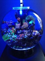The BiOrb comes stock with an under gravel filter style filtration system and it really isn't a good candidate for a reef tank. We decided to modify the BiOrb to make it reef ready. We took the unit apart and found a 3/4 inch hole at the bottom, perfect for fitting a 3/4 inch bulkhead. We then decided to put a 3/4 inch PVC to run up the center of the "Orb" to use as our intake. Afterwards it was necessary to create a return that would run up from the sump along the back of the tank. A Biocube stand was used and a hole was drilled through the center to run the intake down to the sump and into a micron sock holder. Once the tank was placed, we decided to use an Ecoxotic Par 38 light to sustain LPS and "softies". A Mag 5 pump was used in the sump along with a Hydor Nano Slim skimmer and some Chemi-Pure Elite media. We added live sand, Real Reef rock and water to the tank and let it cycle for a week with Dr.Tims One and Only bacteria. As time passed we rearranged the rock several times to perfect the aqua-scape and added fish and coral very slowly. After lots of love, care and observation, we are proud to present the final product and hopefully see more people attempt this fun project. We hope you enjoy these pics!