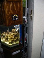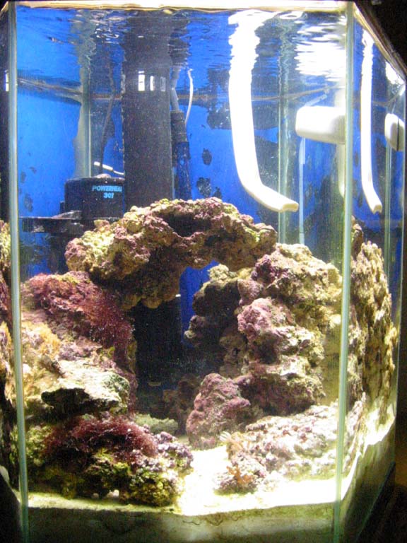 Just wanted to show off a few pics of my new nano setup. I know its not the conventional minibow design that seems to be almost a standard in the nano club now, but it was free and made designing a canopy and overflow system that much more of a challenge. Its a 10 gallon glass hex hooked up to a ~3 gallon ACE Hardware paint bucket fuge (kinda ghetto) via a siphon overflow (couldn't find anyplace that wanted to drill it). Inside the canopy is a 175w 5500k MH (will be upgraded to 10000k when I get some decent corals) retrofit kit from aquaticlight.com (the reflector is DIY - couldn't find a commercial one that would fit inside) with two 3" radioshack fans (currently only using one). The fuge is lit with 2 13w PC 10000k/actinic lights from hellolights. I am planning on adding an autotop-off system to it later once I'm happy that the overflow design is running smoothly (already had it lose siphon once which caused the return powerhead, a maxijet 600, to empty the fuge into tank and ultimately onto and all over my kitchen floor). Tank has been cycling with only sand for 3 weeks and with LR for another 3 weeks so far. Just added a bicolor blenny last weekend