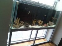 I had custom designed a veneer cabinetry to wrap around the tank. So it looks like it is sitting on a wooden cabinet. I also created a matching top so it would block out the light and direct it into the tank.