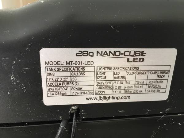 This is a JBJ 28 Gal Nano Cube aquarium, stand, retro fit hood modified to fit w/ Current-USA LED w/ ramp/timer, bulk head pumps, Tunze protein skimmer, heater, media basket, and wave maker. Lighting system is much more cost efficient for saltwater/coral growth than original set up. The aquarium is 100% leak free and in perfect condition (minus normal wear and salt creep from previous set up). I took the tank down to set up my larger 56 gal tank. This is a perfect nano tank for the aquatic enthusiast living the NYC apartment life, even placed the stand on HDuty castors to relocate as needed. I modified the tank by porting the back of the tank for a 10 gal sump refugium tank below and back up to the return hose which enters the top. 10 gal sump and return pump not included (using it on my new sump set up). Extra angle brackets installed to beef up lateral support. Led lights work perfectly to grow LPS coral (SPS if LED intensity increased) and ramp up and down with the timer. The tank needs minor cleaning to make new. I have many other extras which I can provide along with my direction for the build and do's and don'ts of Nano reef keeping. I live in Upper West near 97th. You must pick up.