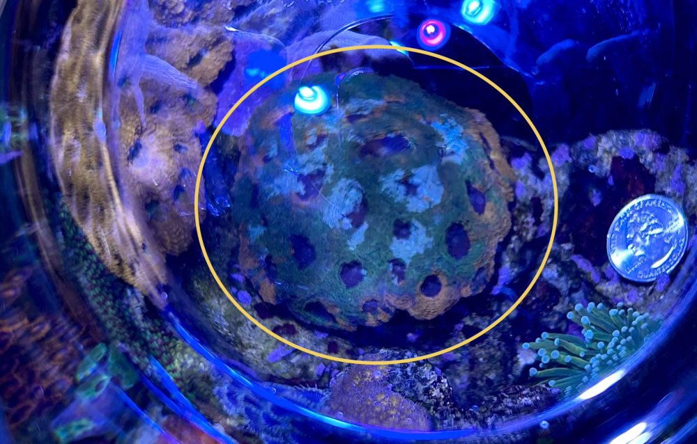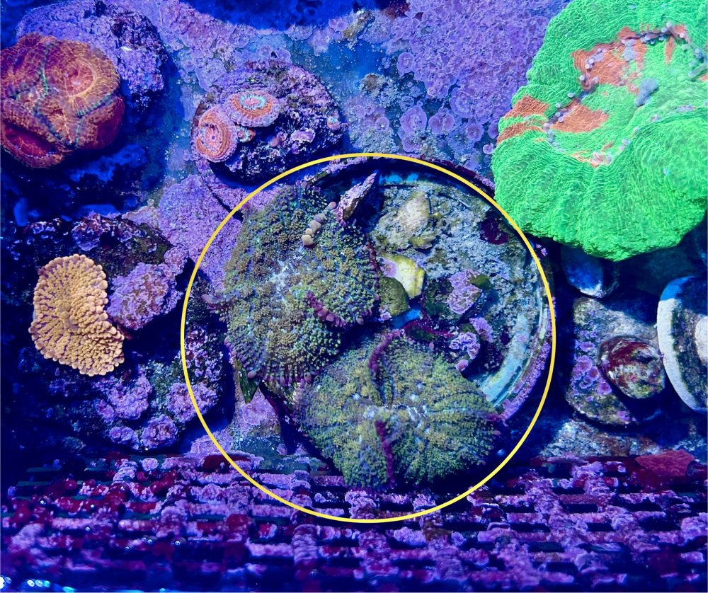 6. Toxic Green Palys - They GLOW under actinics, but I've had them in the shade for a few months, since I didn't want them to walk up other rocks - FREE.