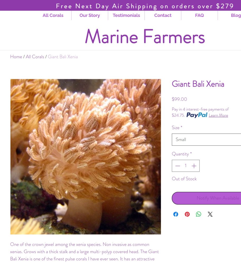 1. Giant Bali Xenia from Marine Farmers 5-6" from top to bottom (NOT Red Sea PomPom that spreads everywhere). This guy stays put like one single palm tree and pulsates a lot - $80. I paid $100 for less than an inch almost two years ago.