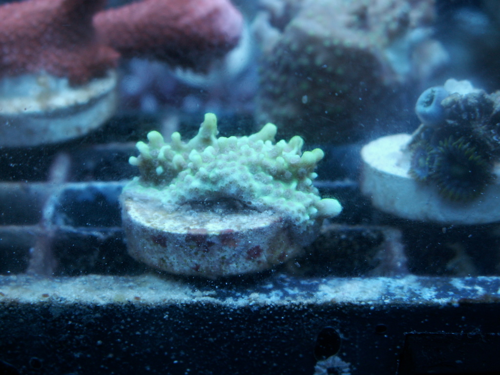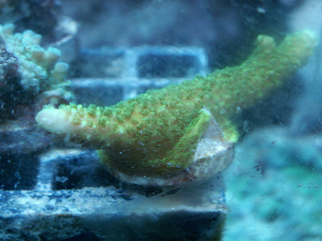 Acro fully encrusted on plug yellow green polyps purple tips. $15